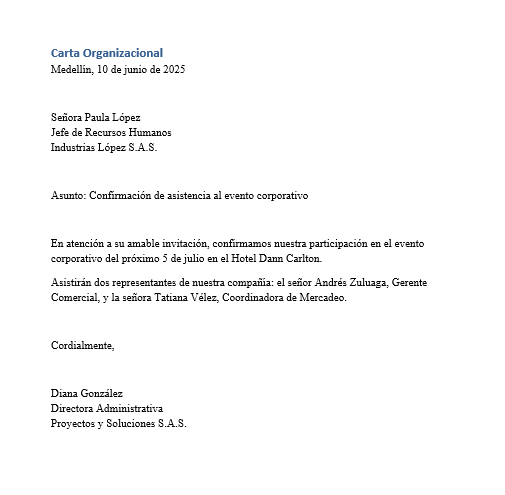 Se escribe en la interlínea libre siguiente al cargo, utilizando la denominación más conocida: razón social, sigla o acrónimo. Si se usa el nombre completo, debe escribirse con mayúscula inicial o sostenida, según el registro oficial, incluyendo denominaciones como Ltda. o S.A. Las siglas y acrónimos se escriben en mayúscula sostenida, salvo que la organización las haya registrado de otra forma. - Dirección